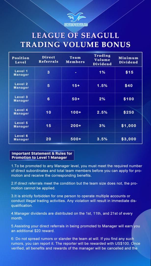 Position LevelDirect ReferralsTeam MembersTrading Volume DividendMinimum Dividend